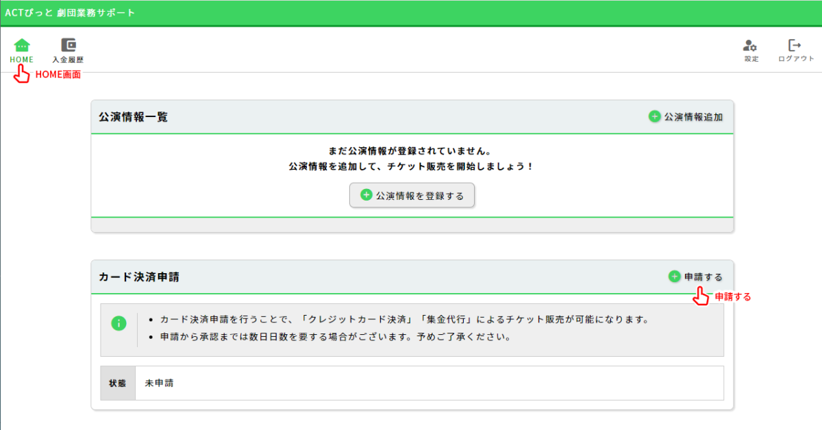 画面下部にカード決済申請の状態が表示されるので、「申請する」ボタンをクリックして申請画面へ遷移します。