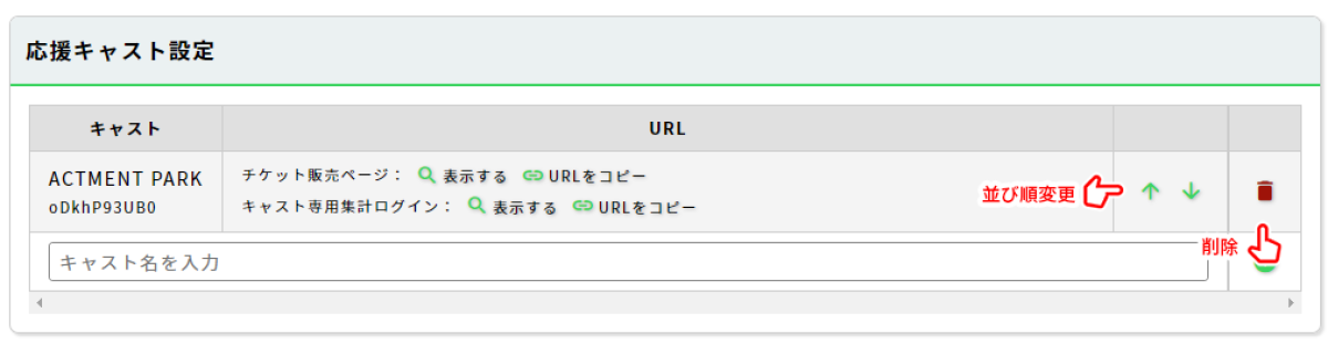 「上へ」「下へ」をクリックすることで応援キャストの並び順を変更することができます。設定された並び順で、チケット販売画面や集計画面に表示されます。
