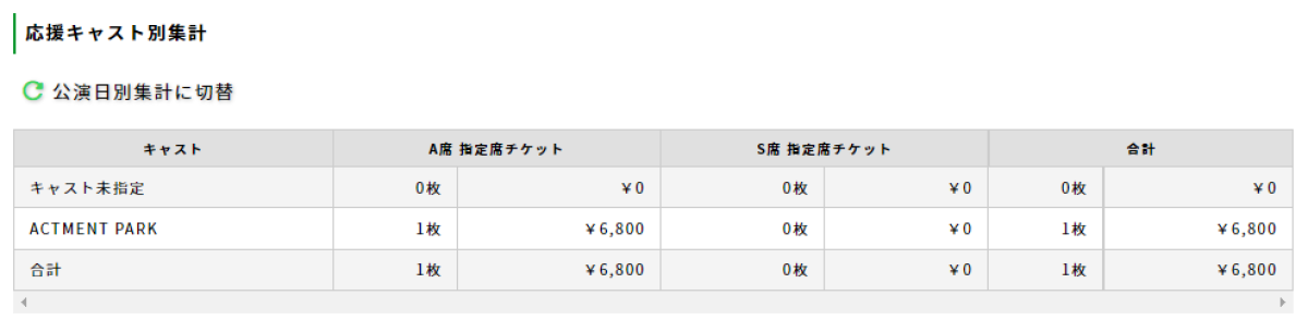上記集計値の合計を表示します。合計に表示されている金額が当該公演にて発生したACTぴっとの預り金の総合計です。