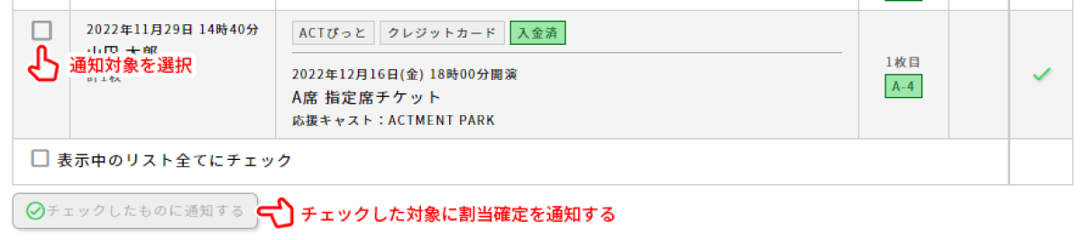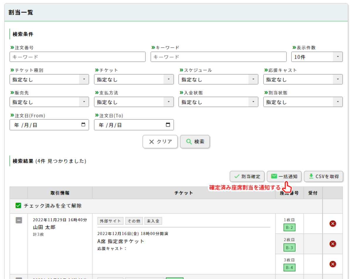 「一括通知」ボタンをクリックすることで、割当確定の通知メールを購入者に送信します。通知は割当確定済みのチケット購入者に送信されます。通知された座席番号は購入者のマイページに座席番号が表示されます。