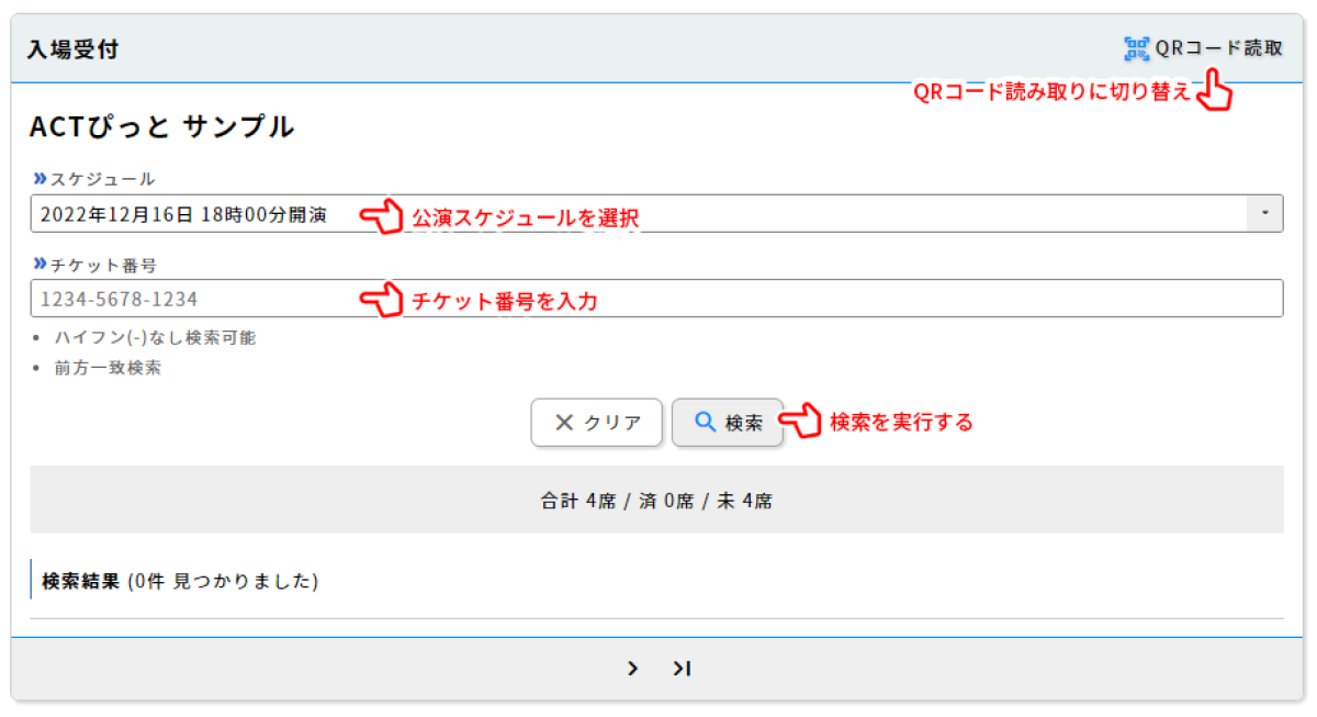 「チケットNo入力」をクリックし、スケジュールを選択、チケット番号を入力することで、該当のチケット情報を検索し表示ます。