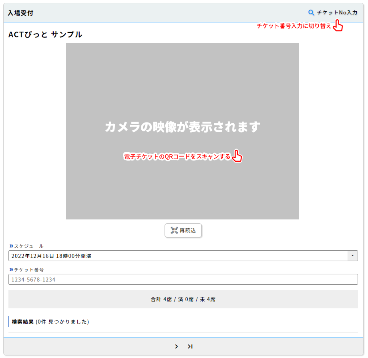 続けて「入場受付」ボタンをクリックすることで該当チケットは入場受付済状態になります。