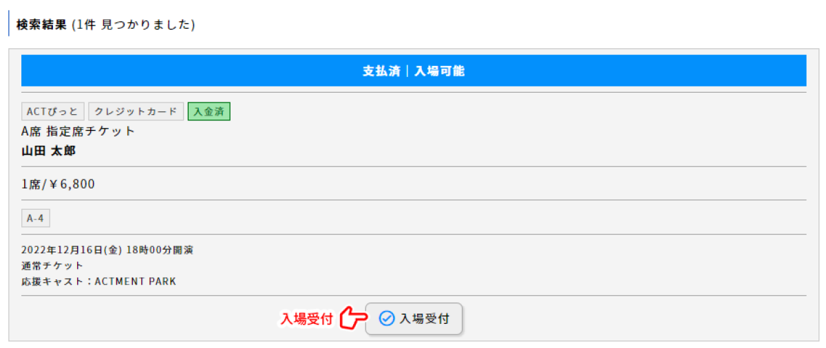 検索に該当するチケットが存在する場合、チケット情報が表示されます。チケット内容、状態が正しいことを確認して「入場受付」ボタンをクリックすることで該当チケットは入場受付済状態になります。