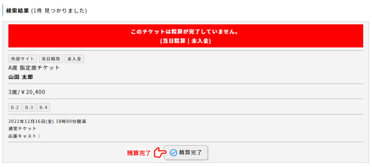 当日精算チケットで未入金の場合、精算未完了として表示されます。受付にてチケット代金の精算を行い「精算完了」ボタンをクリックすることで、入場受付可能状態になります。