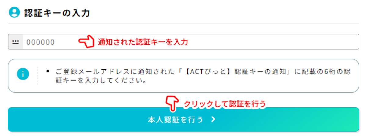 メールに記載された認証キーを入力し、認証が完了すると、会員登録完了です。