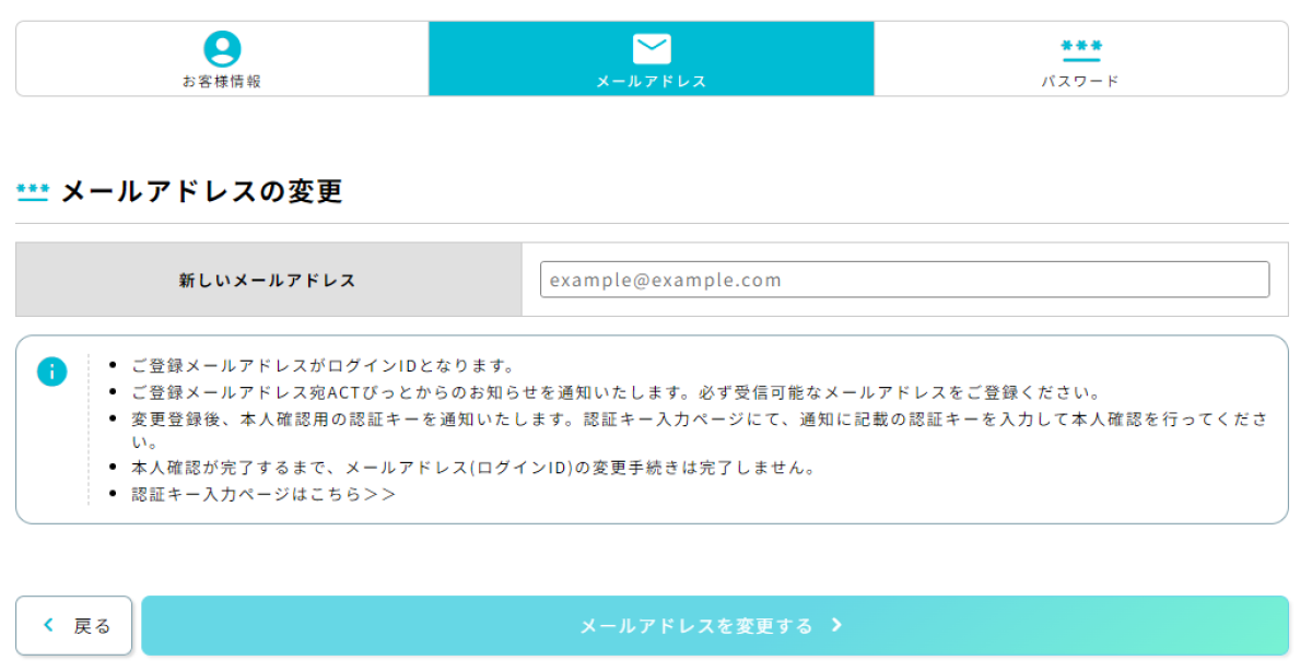変更登録後、本人確認用の認証キーを通知いたします。認証キー入力ページにて、通知に記載の認証キーを入力して本人確認を行ってください。